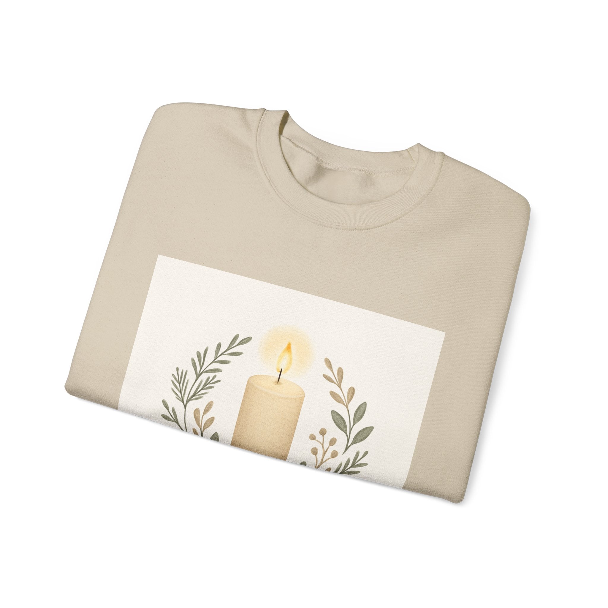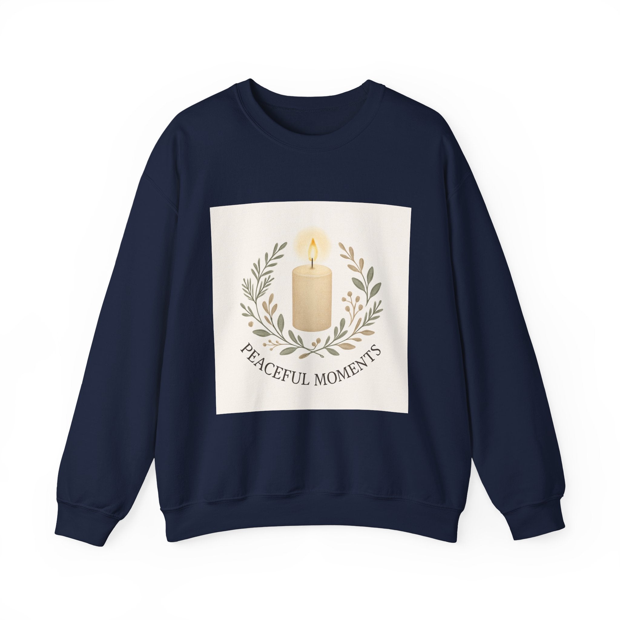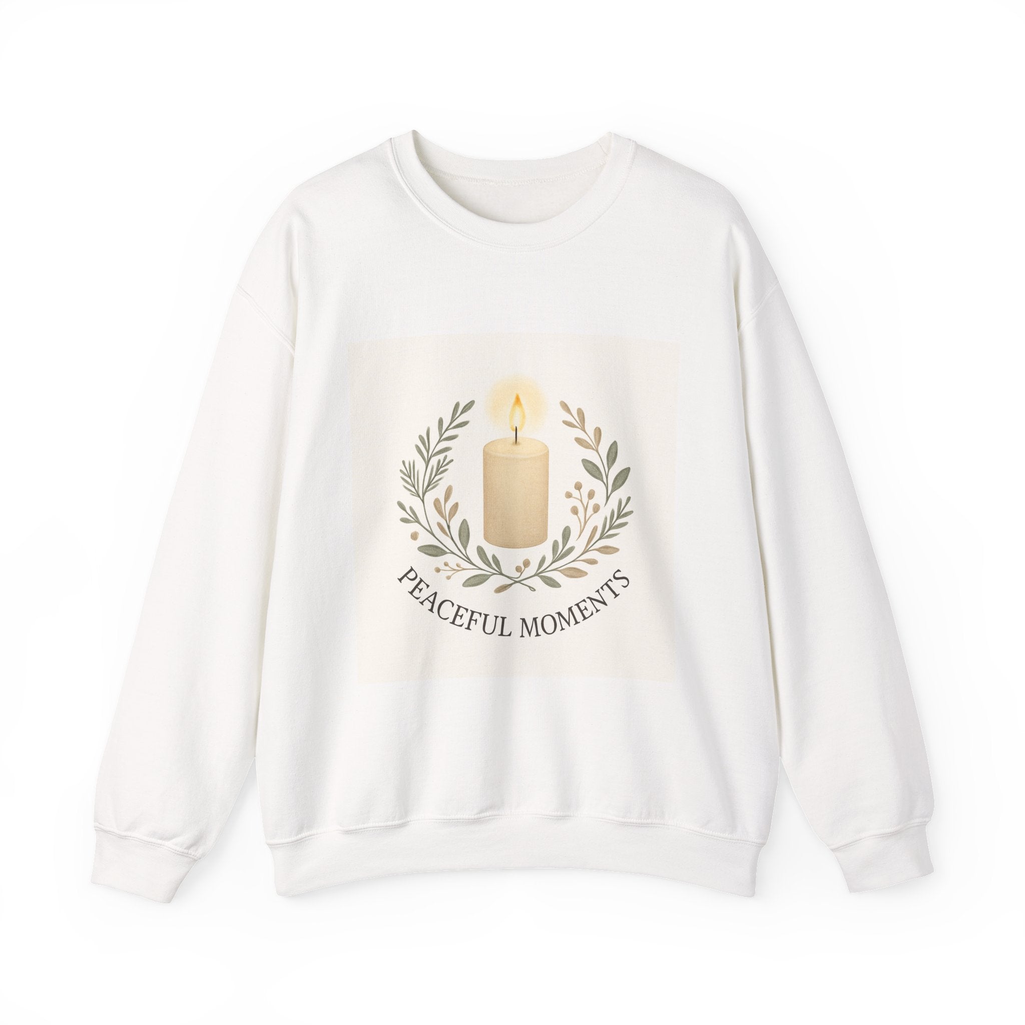 Soft, warm, and quietly elegant — this crewneck wraps you in calm. A single glowing candle sits framed by delicate laurel branches, the words “Peaceful Moments” settling beneath like a gentle reminder to slow down. The clean, neutral palette blends easily into quiet mornings, late-night journaling, or slow walks with a warm drink. Built to wear often, it becomes a go-to layer for anyone who values comfort with a subtle, reflective aesthetic.